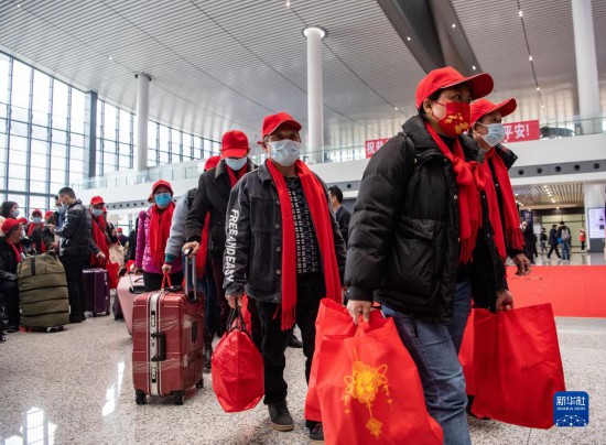 2月16日,返岗务工人员在重庆西站候车厅排队前往检票口,免费乘坐复工专列前往广东省返岗务工。新华社记者 唐奕 摄